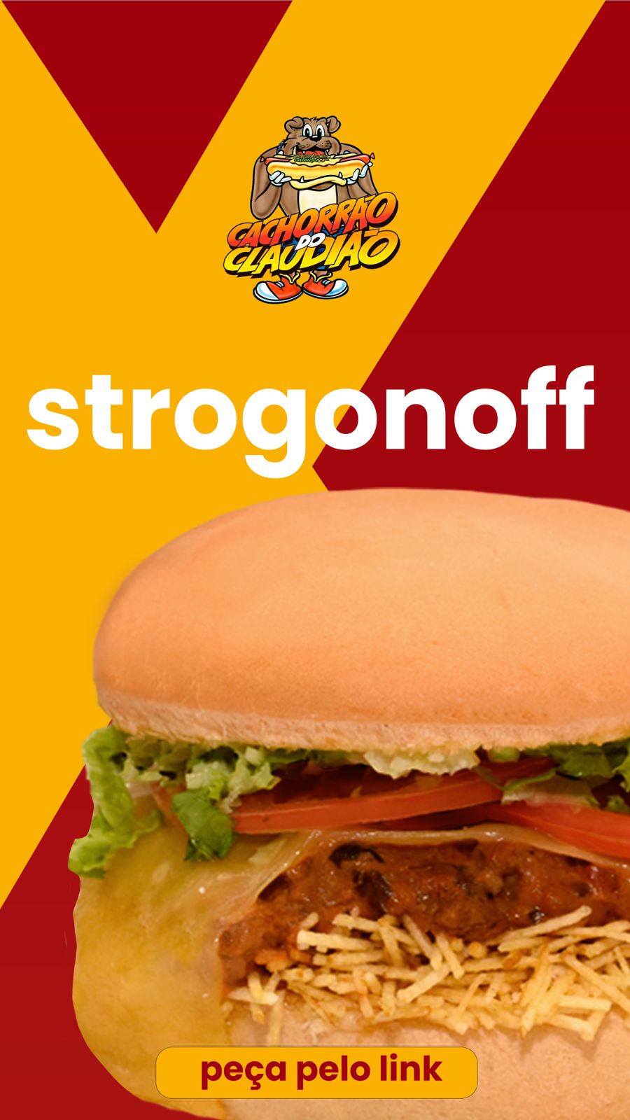 | Pao, strogonoff de carne, molho artesanal, queijo, alface americana, tomate e batata palha |