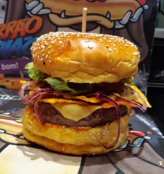 | Pão brioche ,1 hamburguer , Queijo cheddar , maionese ,molho red hot , molho barbecue, , bacon , nacho, cebola roxa , alface tomate. |