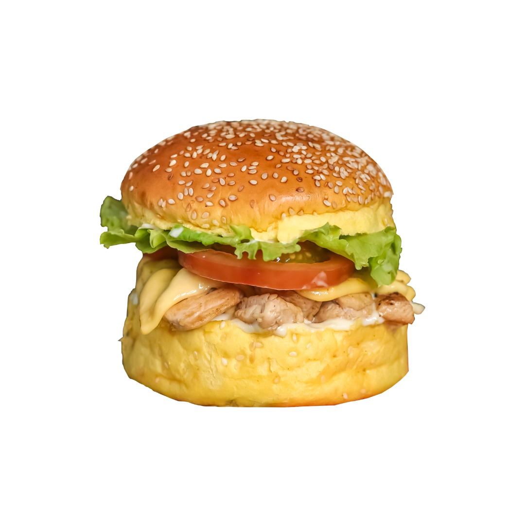 | PAO , UM DELICIOSO HAMBURGUER DE FRANGO MAIONESE ALFACE TOMATE E QUEIJO |